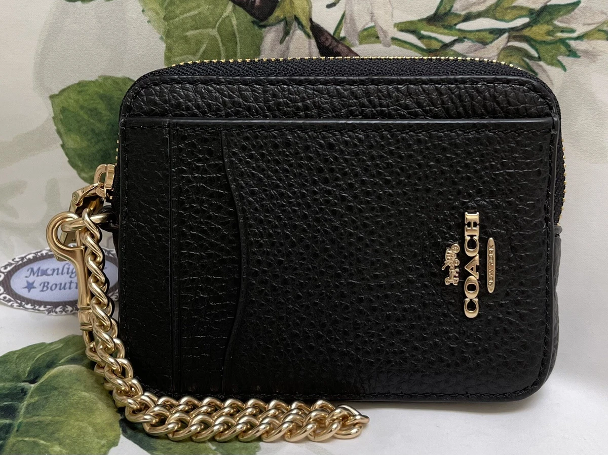 NWT COACH 6303 Zip ID Card Case With Gold Chain Strap BLACK Leather Mini Wallet | eBay